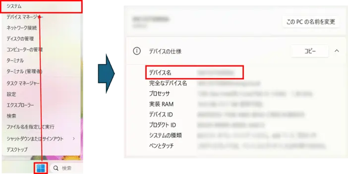 ①下の[Windows]ボタンを右クリックし、[システム]を押します。