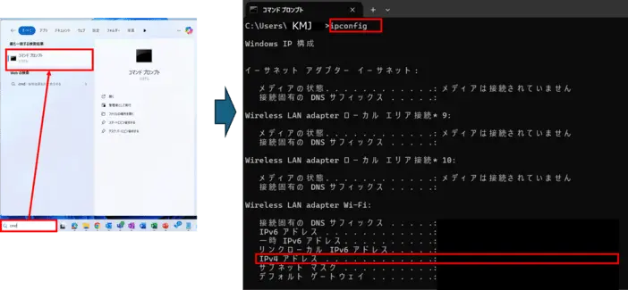 ②キーボードで [ipconfig] と入力し、Enterキーを押します。IPv4アドレスに記載の値が現在利用しているIPアドレスとなります。