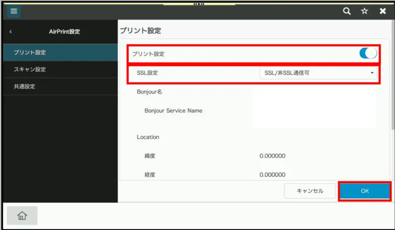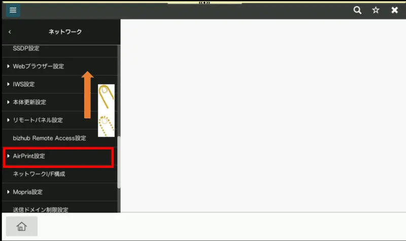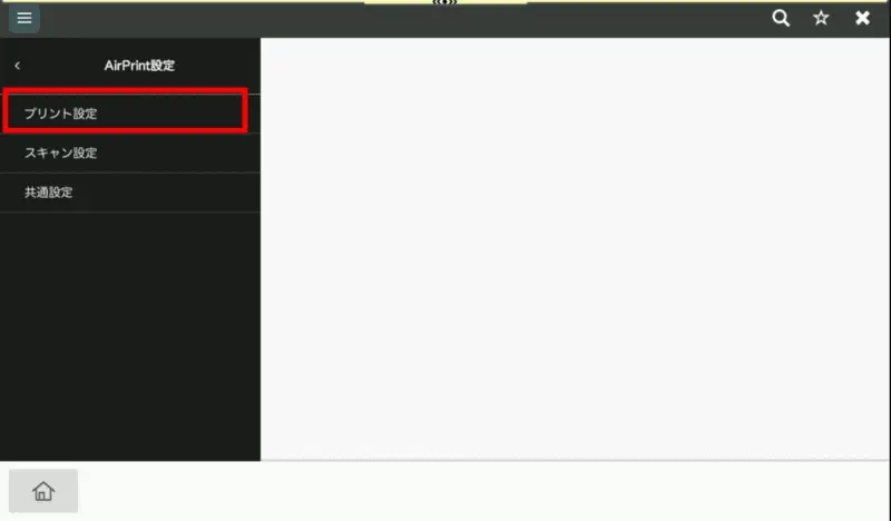- 左メニュー画面を上にスクロールし、[AirPrint設定]を押します。