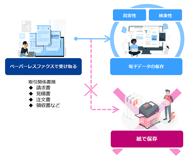 複合機で受信したファクスを紙に印刷せず、PDFファイルなどのデータに変換して受信した電子データは、真実性、検索性などの法的要件を担保して電子データのまま保存する必要があります。