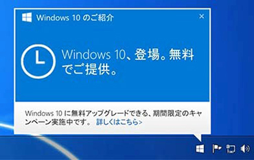 Windows 10 のアップグレード予約が先行して実装され、ウインドウ右下の通知領域に「無料アップグレードの予約」通知が表示されます。