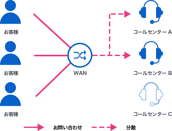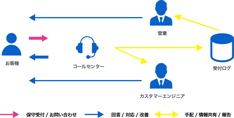 電話着信後は、データセンターの制御により、センター内で待ち時間の長いコミュニケータを自動判別し、電話を着信させます。コミュニケータはお客様の状況に応じた回答やカスタマエンジニアの派遣手配を効率的に行います。また、受付ログから「お客様の声」を抽出分析し、製品開発や改善、また営業や業務・サービス活動の改善に取り組んでいます。