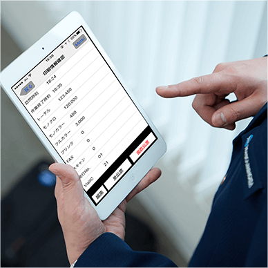 全国のカスタマーエンジニアには、タブレット端末が配布されており、異常検知の連絡から点検伝票の発行まで、統一されたシステムの中で効率的に行う事が可能です。エンジニアの状況は、常にコンタクトセンターと共有され、お待たせする事を抑制しています。使用パーツや交換品はバーコードリード管理によって、誤記などのヒューマンエラーを抑制しています。作業後の点検内容の確認は、お客様視点にたったわかりやすい項目を設定しており、データはタブレットにサインを頂いた後、ご登録のアドレスへ送信致しますので、デジタル管理が可能です。