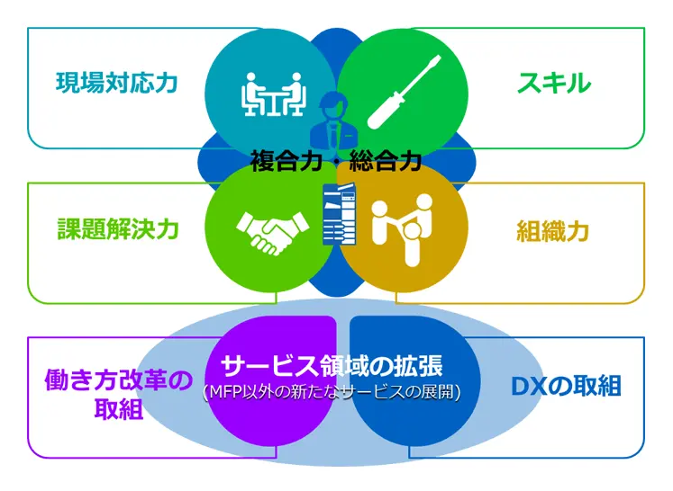 デジタル複合機はIT化が進むオフィスに欠かせない最先端機器です。機器の進化は目覚ましく、顧客企業の要望・ニーズも高度化しています。当社は独自の担当制サービスによるオンサイト保守を通じて、顧客に寄り添いながら課題解決に努め顧客との関係性を大切にしています。複合機を熟知したサービスが予防保守に努め、複合機を活用したDXによる「働き方改革」提案、本当の意味で「顧客のお役に立つこと」を目指したサービス活動を行っています。