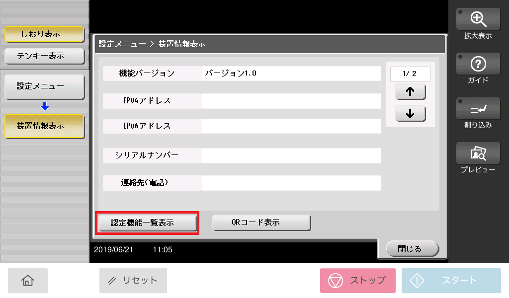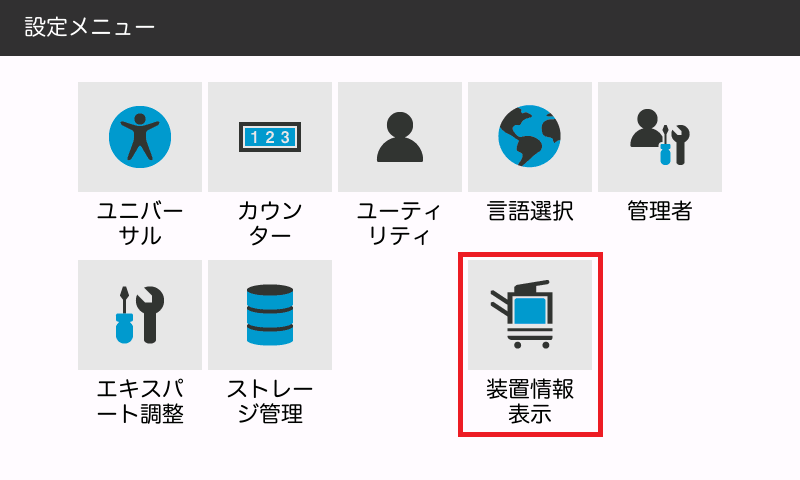 1.トップメニューにて、[設定メニュー]→[装置情報表示]と選択します。
