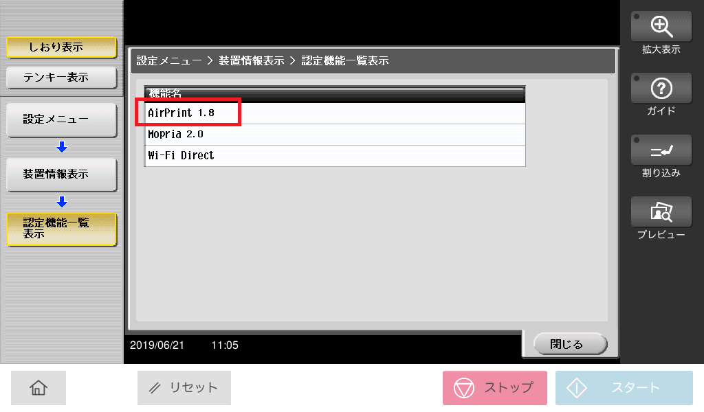2.[認定機能一覧表示]を選択し、AirPrintの項目をご確認ください。