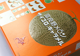 JETvarnish 3D の加飾効果が目を引く富良野メロンサイコロキャラメルのパッケージ