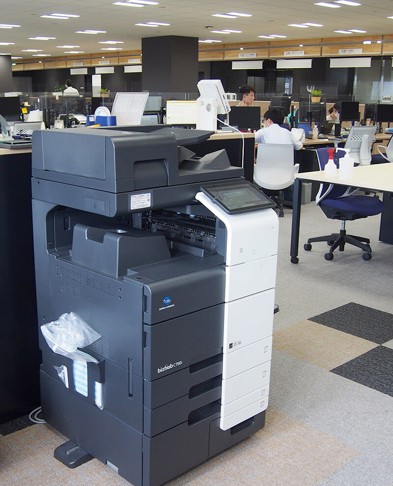 複合機のメンテナンス、サポートの面でも大きく変わりました。それぞれの部署ごとに管理が任されるようになったため、不具合が起こったときも、デジタル戦略室を通さなくてもよくなりました。「コニカミノルタさんに部署ごとに直接サポートを依頼するのでワンクッション減って、解決がスムーズになりましたね。故障の際、デジタル戦略室が代替機を用意する必要もなくなりました」(村社様)。