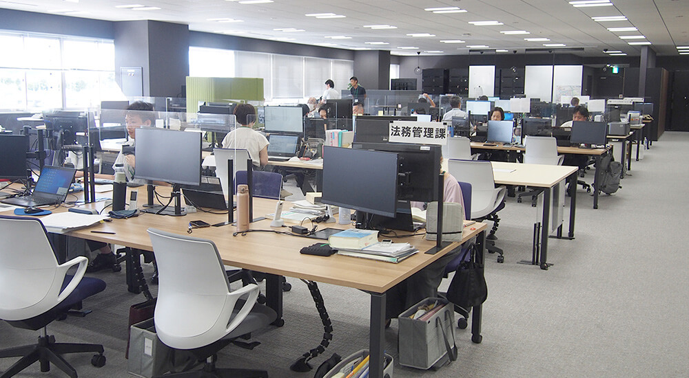 「新庁舎は、2022年11月に開庁しました。4階以下の執務スペースは、間仕切りの少ないオープンなスペースで構成され、複合機は南北の両端に1台ずつ設置。これまでの部署ごとの配置から、基本的にフロアごとの配置に変更されました。「新庁舎では、全フロアで専用のデスクを持たないフリーアドレスが採用されました。ICカードを使いたい複合機にかざせばいいので、部署ごとの機器に縛られる必要はありません。空いている複合を使えばいいわけです」(村社様)。