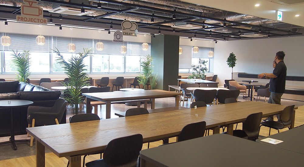 新庁舎の5階には職員の誰もが使えて自由に仕事ができる多目的スペース "en-gawa" が設けられました。また各フロアには個々の職員が作業に集中できる個室、集中ブースが備えられています。「5階にはフィニッシャー付きの複合機を1台設置していて、大量に印刷したい職員はよくここを利用していますね。集中ブースも、ノートPC を持ち込んで、すぐ近くの複合機から出力できるから便利です」(村社様)。「たとえば、会議で急遽資料を追加することになっても近くの複合機から出せる。業務の効率化につながっています」(竹中様)。