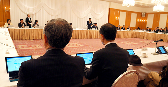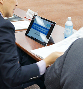 審議会のペーパーレス化促進のため、100台のタブレットを導入した環境省様。電子化による環境負荷低減とコスト削減効果はあったものの、タブレット端末への会議資料格納作業に大きな手間と時間がかかっていました。この課題をコニカミノルタの提案するペーパーレス会議システム「Smart Discussion」が解決。全端末への資料配信がワンタッチで実現し、会議資料準備の手間の大幅削減に成功。また優れた操作性と多彩な機能で、省内のさまざまな会議の効率的な運用をサポートしています。