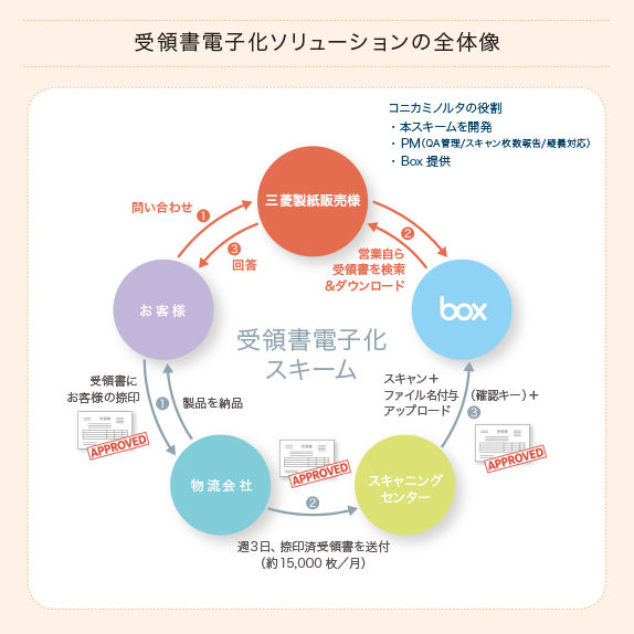 2016年に社内書類保管規則の見直しが行われ、受領書の問題を解決する方策が検討されました。数社によるソリューション提案が行われた結果、コニカミノルタの提案が採用されました。これは、物流会社から送付されてきた捺印済受領書をスキャニングセンターにて、確認キーをファイル名として付与した電子データに変換、順次クラウドストレージの「Box」にアップロードするというもの。「この一連の手順が非常にスピーディーだったこと。また当社のデータベースシステムと連動した確認キーによって『Box』の検索がスムーズに行えること。この2つが導入の決め手となりました」(坂元様)。「さらにクラウド利用で、サーバーなどのハードを購入する必要がなかったことも採用の理由の一つです」(篠原様)。2017年3月にコニカミノルタに内定、8月に利用開始、10月から本格始動を始めました。