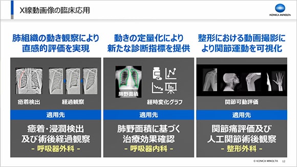コニカミノルタは、「単純Ⅹ線検査は静止画撮影」の従来常識の枠を超え、単純X線撮影により得られる情報の価値を高め、診断精度向上に貢献したいと考えています。