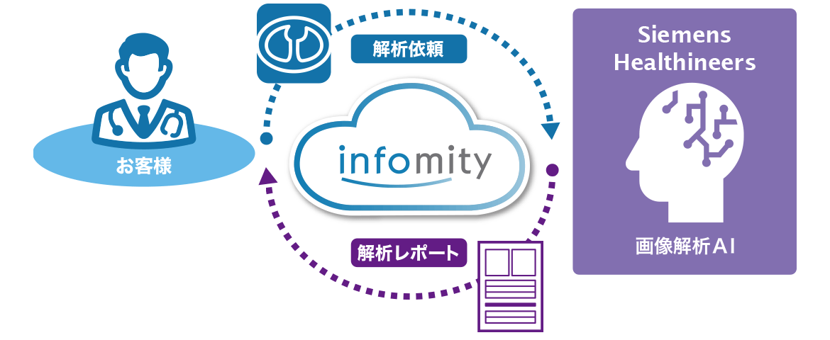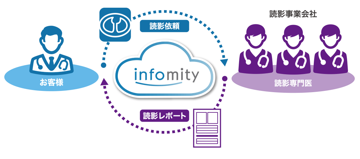 コニカミノルタのデータセンターを介して、提携している読影事業会社へ読影依頼が可能なサービスです。