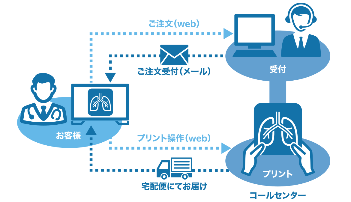 肺がん検診や患者様のご紹介等でフィルムでの画像出力が必要な際に、お客様ポータルサイトからご注文いただければ、お客様に代わりコニカミノルタがフィルムでの画像出力を行い、後日郵送でお届けします。