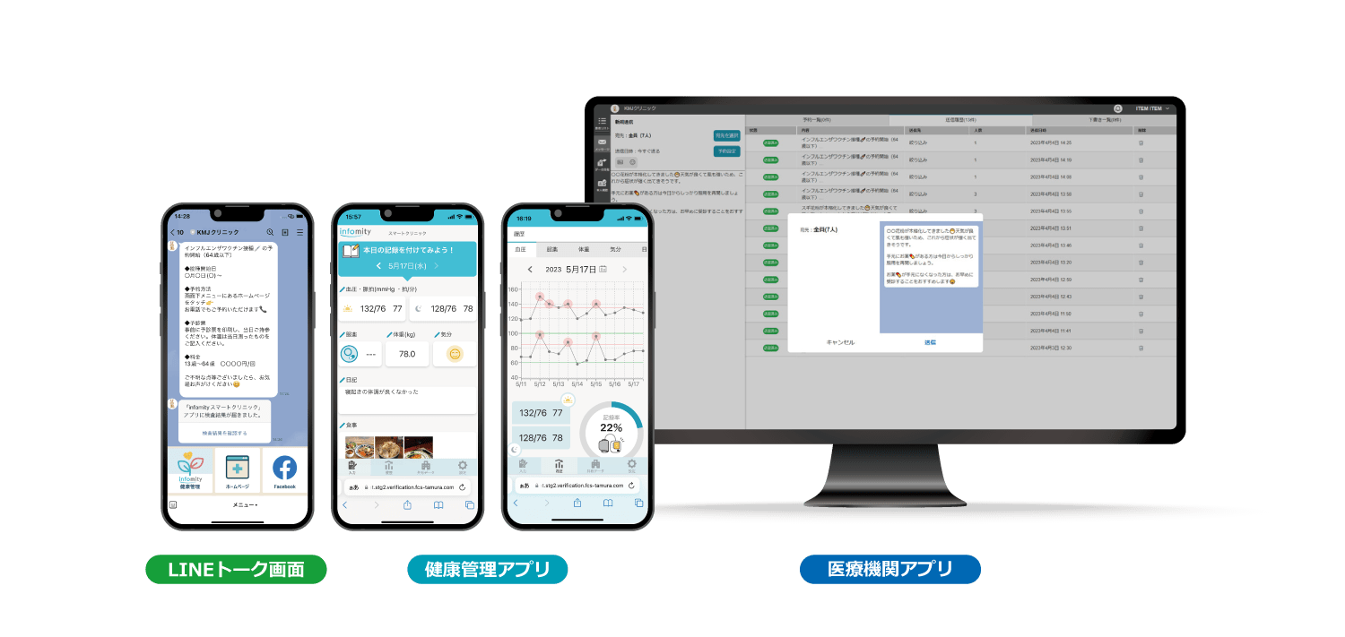 - 医療機関は、患者さんが記録した健康管理アプリのデータを確認することができます。