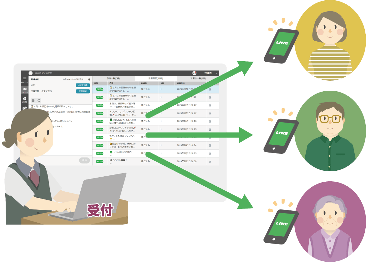 患者さん向けに配信するメッセージは、ご年配の方も利用されているSNSアプリ「LINE」で確認できます。