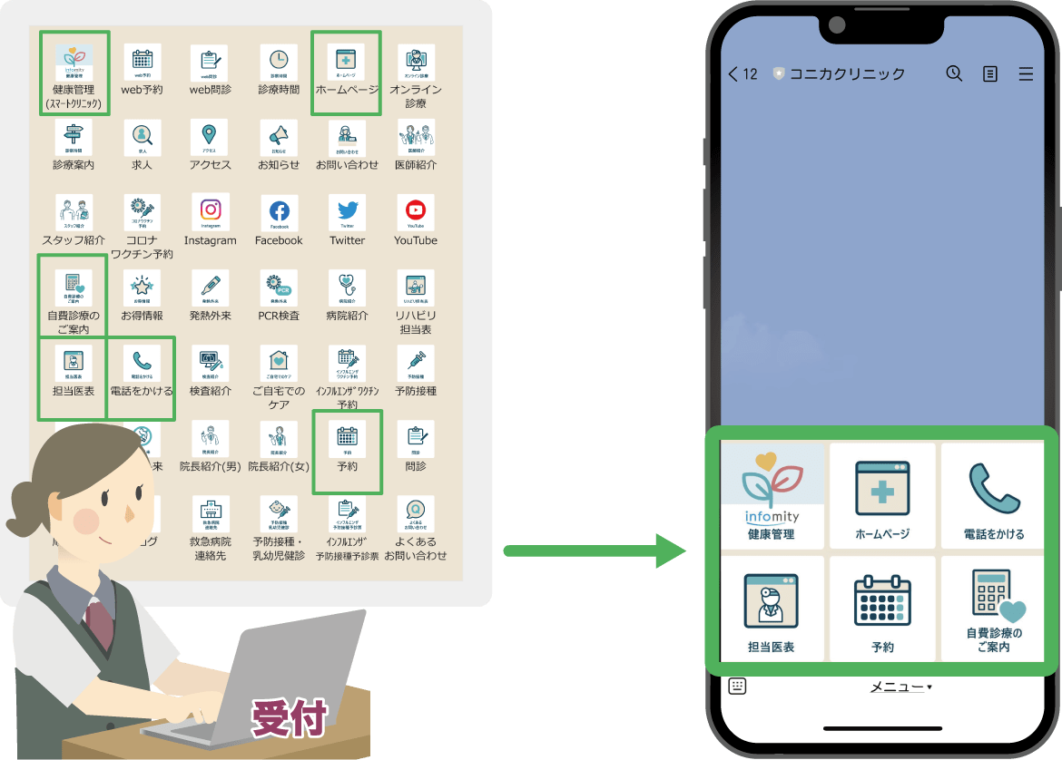 スマートクリニックの医療機関向けリッチメニューボタンを使えば、簡単にメニュー登録を行うことができます。