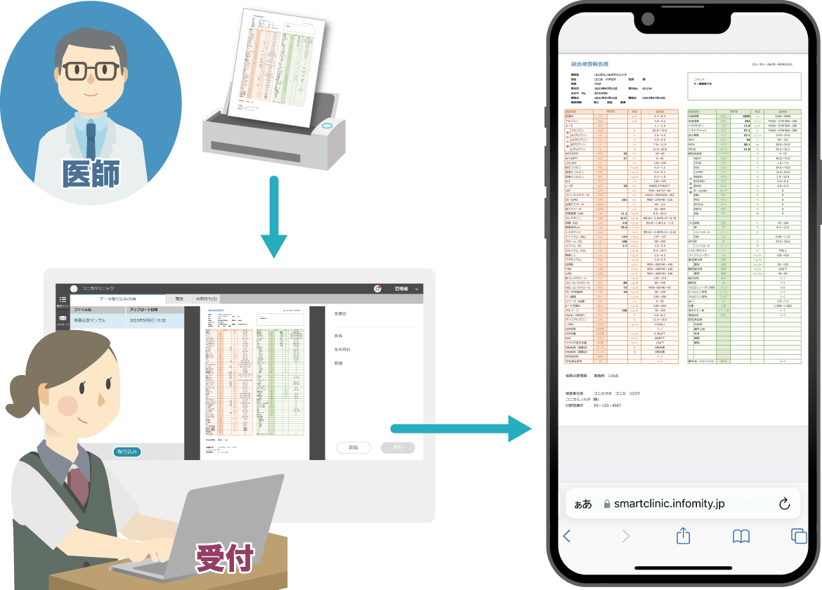 血液検査結果用紙などの画像を、医療機関から対象の患者さんに、セキュアな環境下で送信することができます。