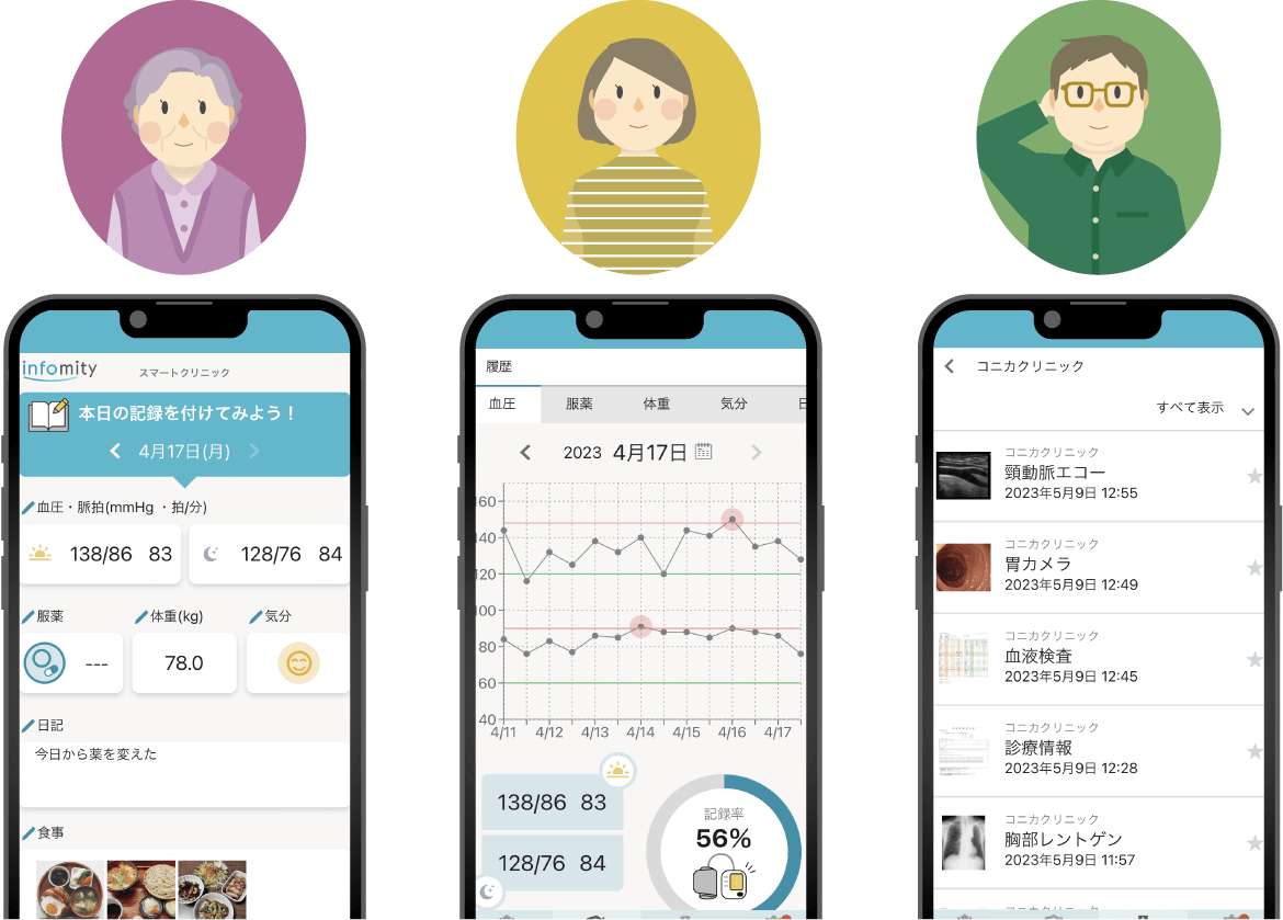 患者さんは無料のアプリで健康管理ができます。必要があれば、医療機関は、患者さんの健康記録を参照することができます。