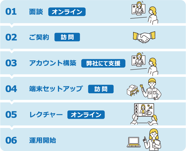 LINE公式アカウント開設やサービスマンによる端末設定等の構築はもちろんのこと、運用開始後もスムーズにサービスを活用いただけるようサポートいたします。