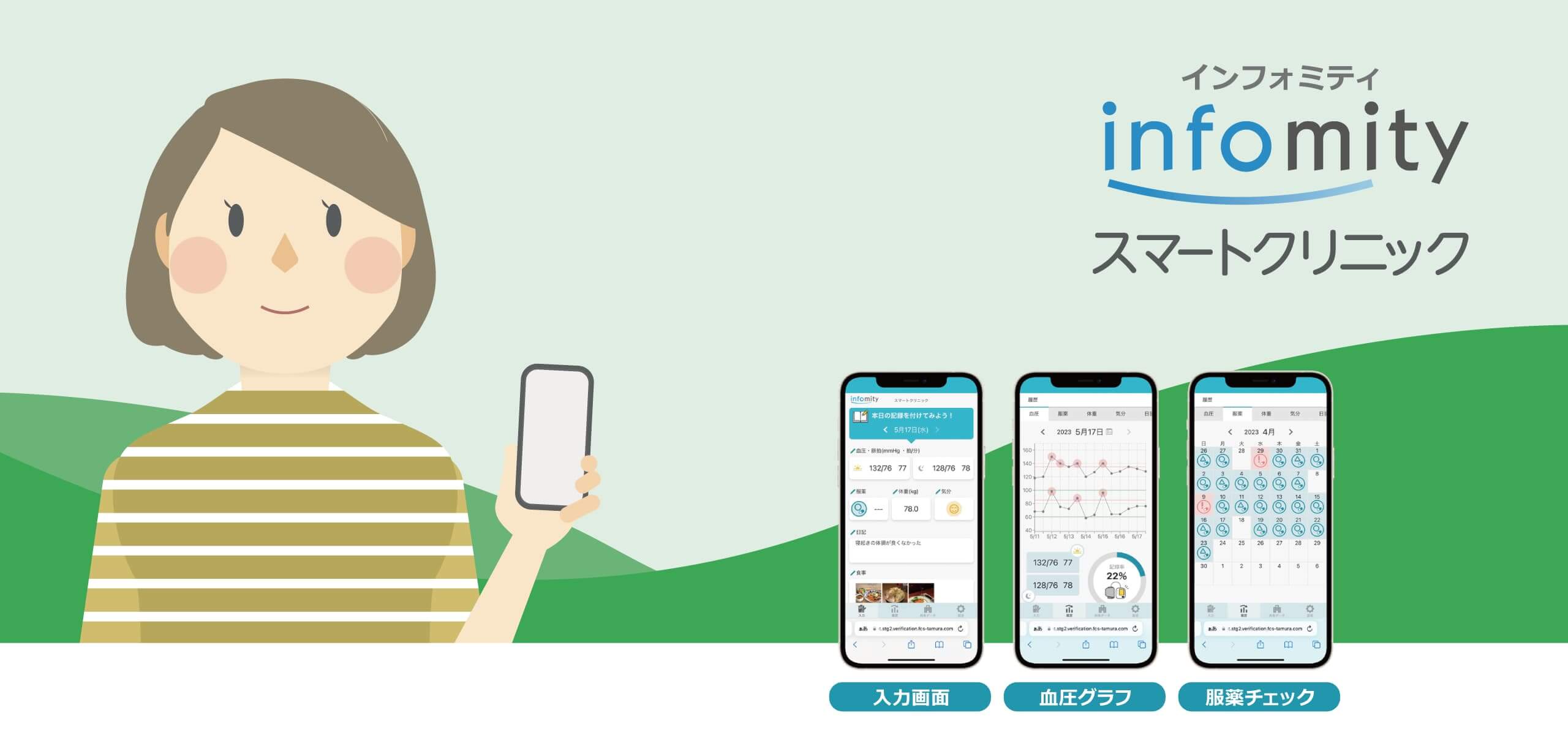 infomity スマートクリニック(以下「スマートクリニック」)は、スマートフォンを使って、医療機関からのお知らせを受信したり、健康管理ができる新しいコミュニケーションツールです。