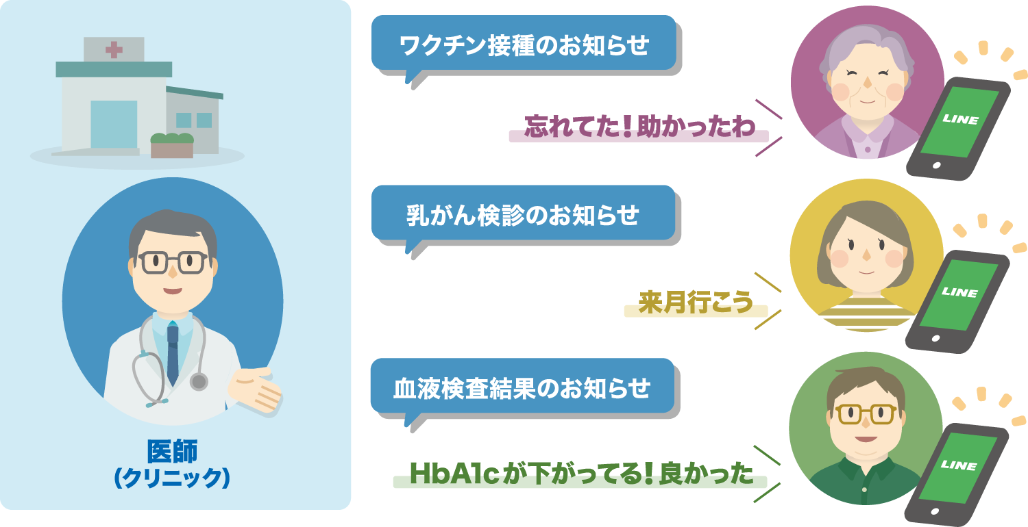 医療機関からのお知らせを、あなたのスマートフォンに。臨時休診、予防接種の予約のお知らせ、疾病情報など、これまで電話やWebサイトで確認していた情報が直接届くようになります。