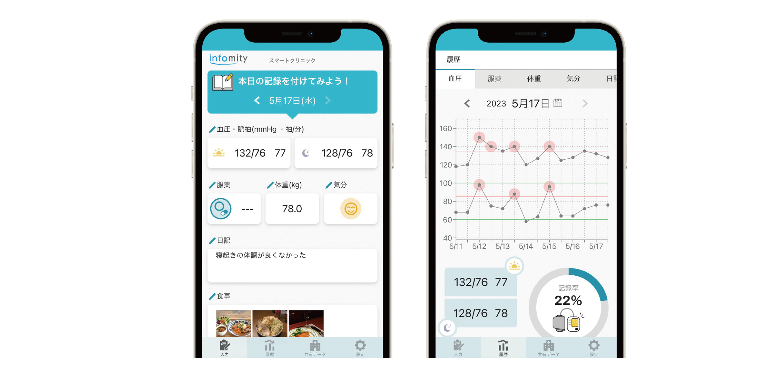 あなたの血圧、体重、服薬、気分、日記、食事、血糖値をアプリに記録できます。