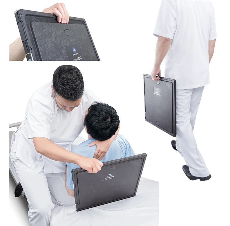 ワイヤレスカセッテ型DR「AeroDR swift」は、高画質ながら軽量化(半切サイズ1.9kg/17×17インチサイズ2.3kg、各バッテリー込み)と全周深さ4mmのくぼみ構造により、ハンドリングの良さでX線撮影作業の負担軽減と運用改善に貢献します。また「CS-7」では「RADInsight」との連携を強化し、ワンタッチで「RADInsight」を起動して基準画像を表示可能です。撮影時に必要な情報を効率的に提供します。