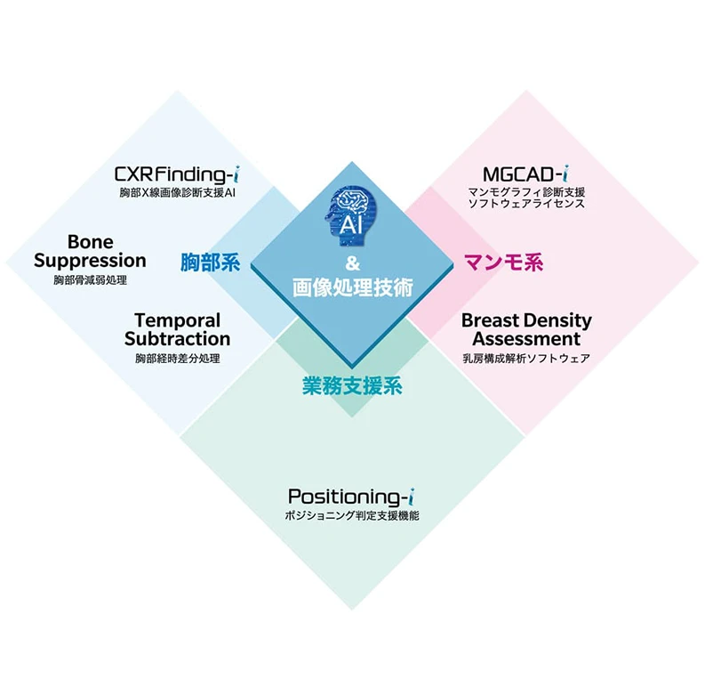 病変検出支援AIや業務支援AIなどのヘルスケアAIや多彩な画像処理技術を展示いたします。胸部X線画像診断支援AI「CXR Finding-i」、ポジショニング判定支援AI「Positioning-i」をはじめ 、AIを活用した医療向けコミュニケーションア プリ「MELON」や介護施設向けケアサポート「HitomeQ」などもご紹介いたします。画像処理技術では、胸部骨減弱画像処理「Bone Suppression」、胸部経時差分処理「Temporal Subtraction」、乳房構成解析「 Breast Density Assessment (Bda)」、マンモグラフィ CAD「MGCAD-i」で診断を支援します。現在開発中の最新AI技術も展示しておりますので、ぜひご体感ください。