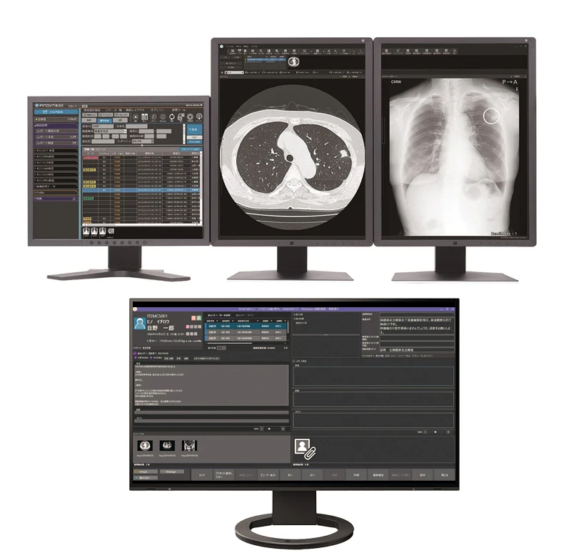 「FINO.VITA.GX」は、新機能が加わりさらなる性能向上を実現しました。CT画像の同期操作をスムーズかつ正確に行う胸部/腹部CT同期位置アシスト機能や、解析精度を高めた胸部AI機能が搭載され、読影の操作性を大幅に改善します。また放射線、マンモグラフィ、内視鏡、超音波と幅広く対応可能な「FINO.REPORT」は、AI判定と読影結果を突き合わせる機能を実装し、精度の高い読影をサポートします。
