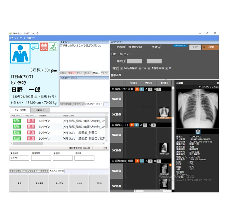 「RAD Link」は、一般撮影の業務効率化と医療安全に貢献するワークフローです。一般撮影コンソール「CS-7」と部門業務統合管理システム「FINO.WorkManage」、一般撮影マネジメントシステム「RADInsight」、そして被 ばく線 量管理システム「FINO.XManage」を連携することで、検査開始時に基準画像や写損も含めた過去画像の参照が可能となります。また検査終了後に照射録の作成を可能にします。