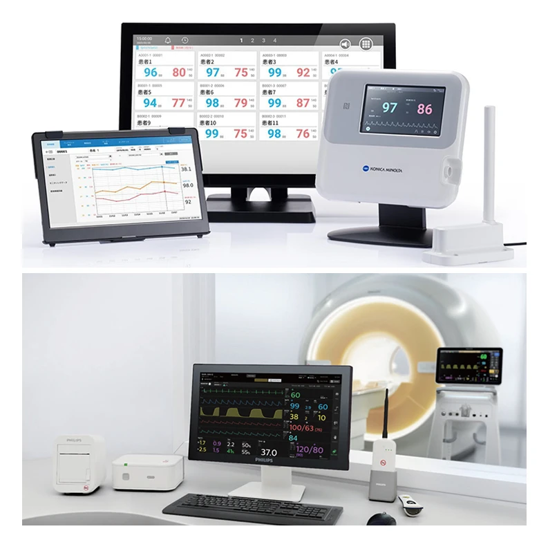 「モニタリングシステム VS1」は、多人数監視用のサチュレーションモニターです。オプションの「看護記録支援システム」との組合せで、特に夜間看護配置の少ない療養病棟など、コメディカルの看護業務を支援します。「Expression MR400」は 、カプノメータ(EtCO₂モニタ)搭載のMRI対応生体情報モニタリングシステムです。鎮静下の小児MRI検査等において患者様の換気のモニタリングを目視化します。