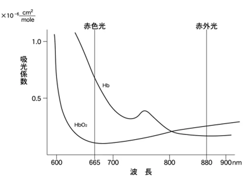 2本のグラフはHbO2とHbがどの波長をよく吸収し、どの波長をあまり吸収しないかを表わしています。線が下に行くほど、その波長を吸収しない(良く通す)ことを意味します。