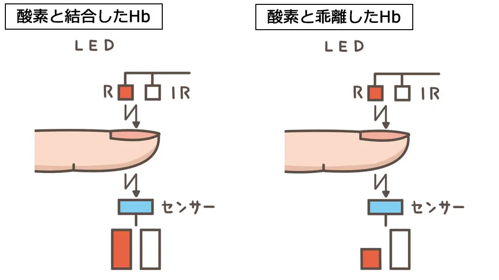 パルスオキシメータは動脈血の赤色の度合いを見て、酸素飽和度(酸素に結びついたヘモグロビンの比率)を見ています。