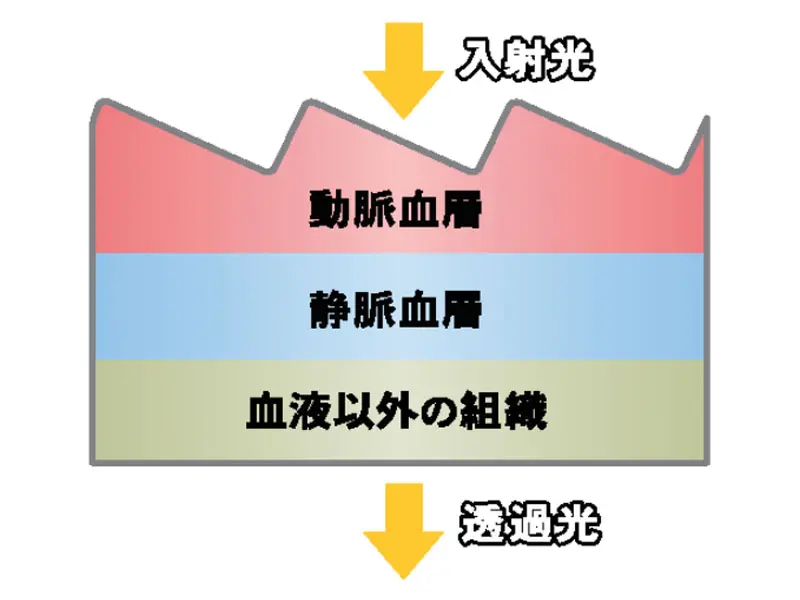 生体に照射された光は動脈血層、静脈血層、血液以外の組織を通るなかで各層で吸収を受けてセンサーに届きます。