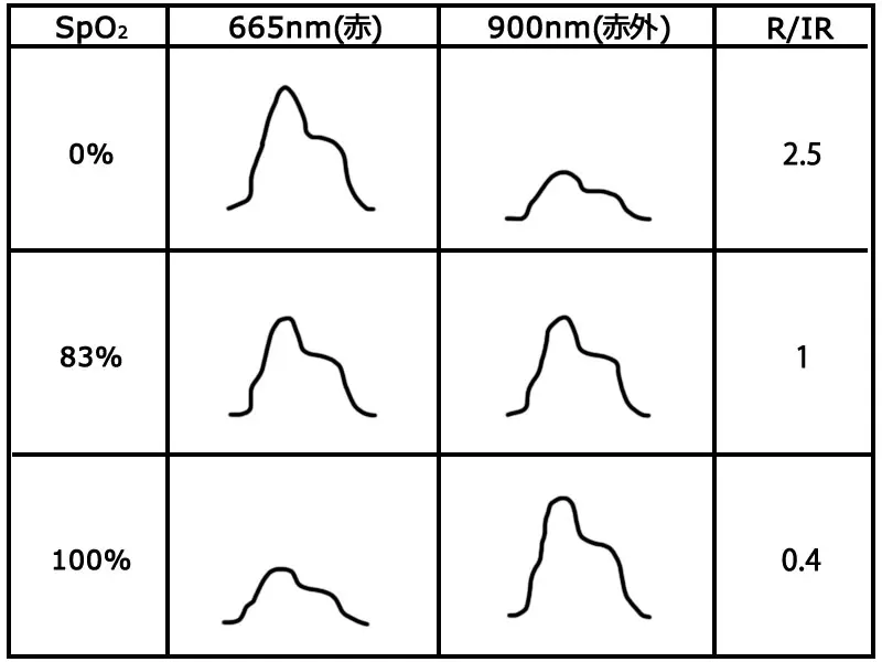 HbO2が増え、Hbが減れば、センサーが受け取る赤色光(R)は多くなり、赤外光(IR)はあまり変わりません。その逆では赤色光は少なくなり、赤外光はやはりあまり変わりません。