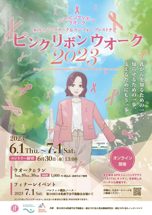 「第19回ミニウオーク&ラン フォー ブレストケア『ピンクリボンウオーク2023』」(共催:第31回日本乳癌学会学術総会・認定NPO法人乳房健康研究会・認定NPO法人ハッピーマンマ)に協賛しました。「乳がんを知るための一歩、知らせるための一歩、支えるためにもう一歩」を合言葉に約1,000人が参加し、2023年7月1日に神奈川県横浜市での第31回日本乳癌学会学術集会の終了直後に盛大なフィナーレイベントがおこなわれました。