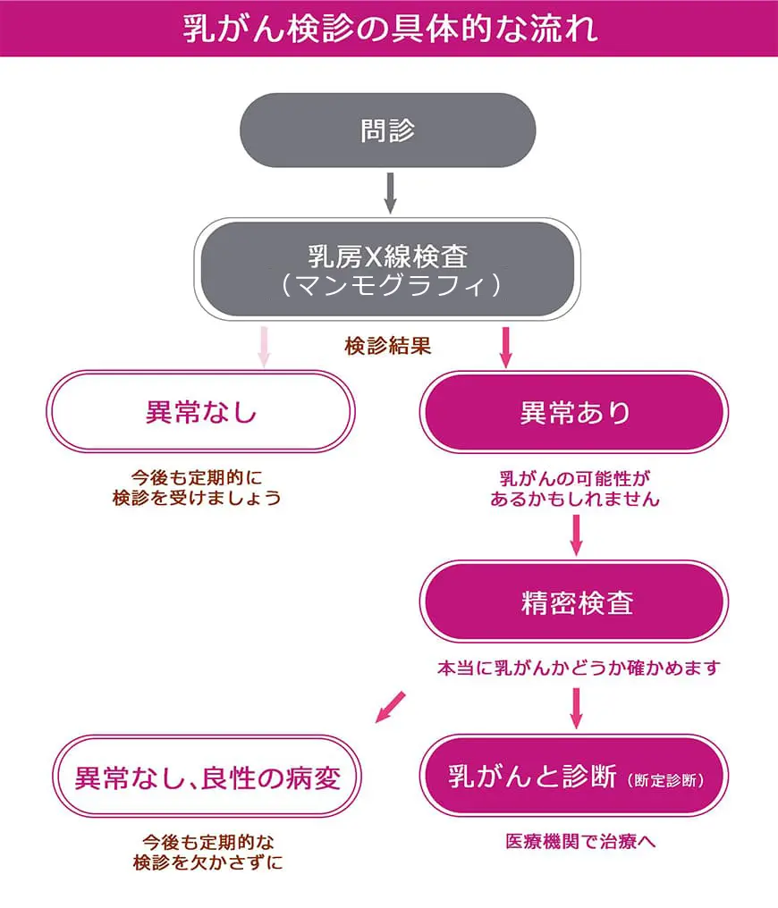 医療機関での検診では、乳房チェックではわからない初期のがんの発見が可能です。一般的な乳がん検診は、問診のあと、視触診、マンモグラフィ、超音波などの検査を行います。画像検査としてはマンモグラフィが基本ですが、年齢によって有効性が異なるため、超音波を併用することもあります。