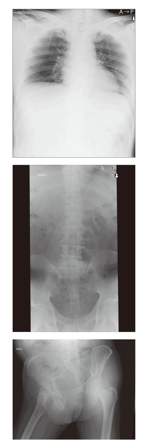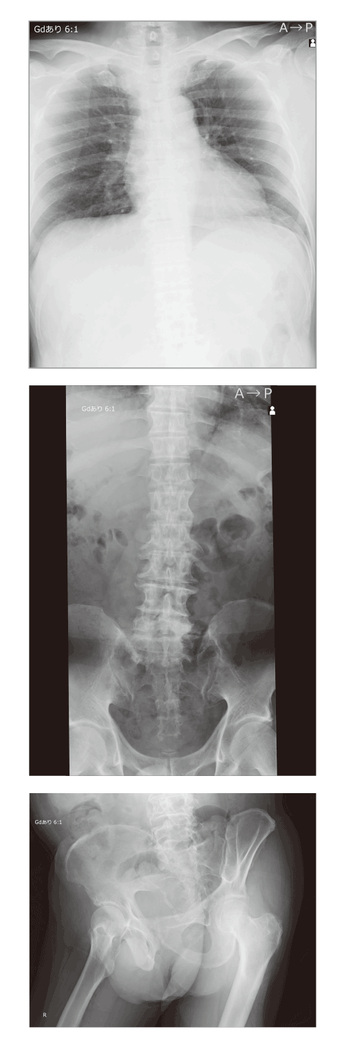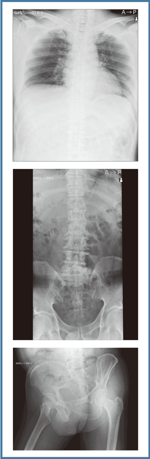 頭部(正面・側面・タウン)/聴器/頸部(正面・側面・斜位)/頸椎(正面・側面・斜位)/胸部(正面・側面)/胸椎(正面・側面)・腰椎(正面・側面・斜位)・腹部(正面/側面)/膀胱造影/手指骨/足根骨/足趾/足指骨/小児胸部(正面・側面)/乳幼児(胸腹部)/新生児(胸腹部)