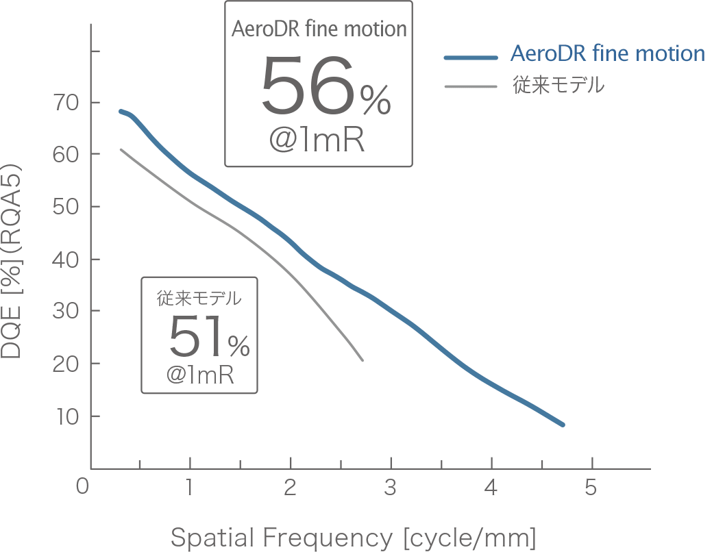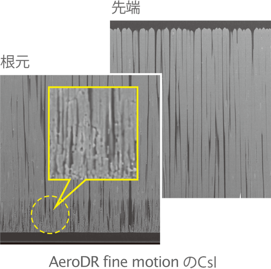 「高解像」を実現しながら、一方で「高DQE」化を目指し、従来モデルよりも高いDQE56% (1mR,1cycle/mm)を達成。 CR時代より培った独自の蒸着技術により根元から先端まで整ったCsI(ヨウ化セシウム)柱状結晶層を形成し、発光の拡がりによる鮮鋭性の低下を抑えながら厚膜化し、X線吸収率を向上、さらに低ノイズ読出ICの開発により従来モデルからノイズを低減することで、高いDQEを実現しました。