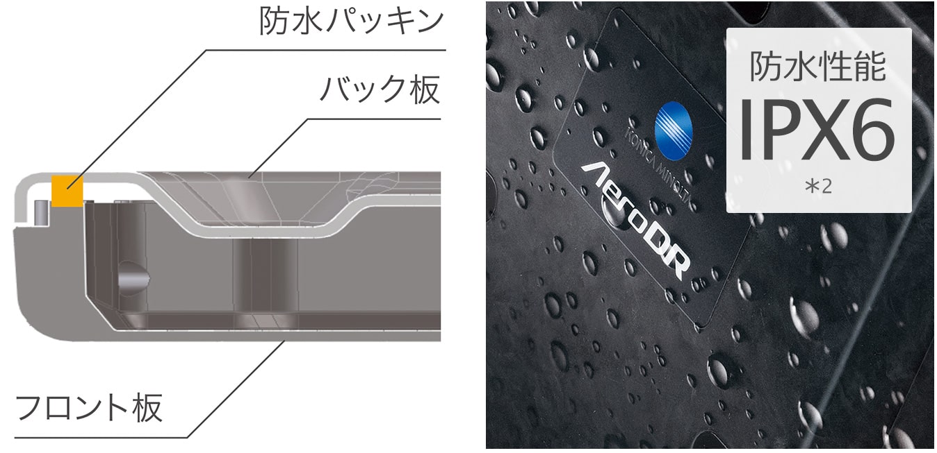 IPX6*2を確保。さらにフロント板とバック板の間に防水パッキンを挟む構造により、落下等による衝撃を受けた場合でも防水性能を維持しやすい構造です。