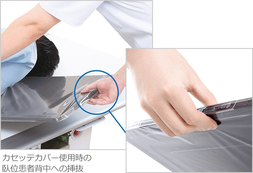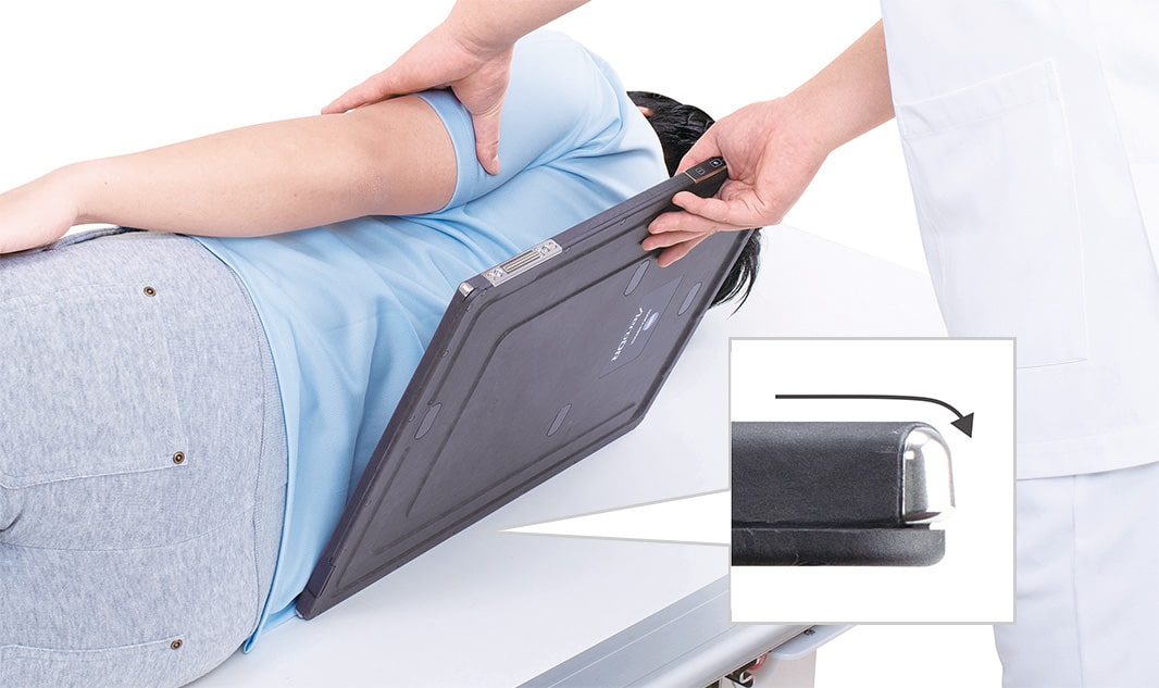 ポータブル撮影などにおいて患者の背中にパネルを挿しこむ際に、背中が痛くないよう配慮した設計になっています。