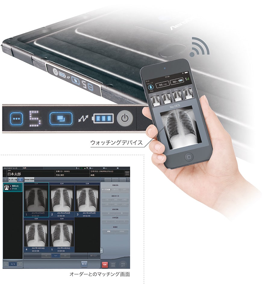 パネル単独でも撮影可能な「Aero Storage」機能を搭載。最大100枚までパネル内部に画像保存が可能で、コンソールへの画像取り込みやオーダーとのマッチングも簡単な操作で行えます。オプションのウォッチングデバイスとの併用により、患者下に置かれたパネルを覗き込むことなく手元でパネルの状態が確認できるため、パネル単独撮影時でも安心して撮影に臨めます。