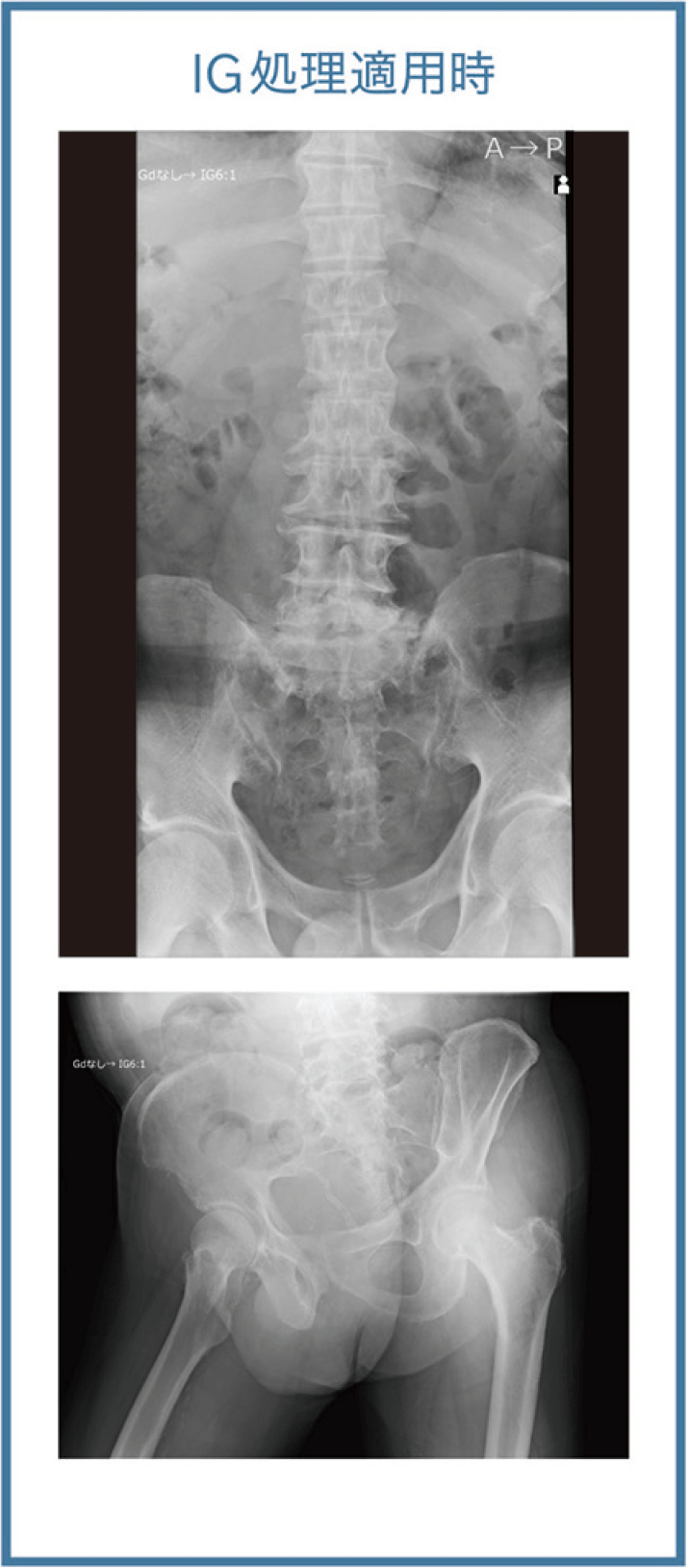 散乱線補正処理「インテリジェントグリッド」との併用により、使用シーンはさらに拡大。グリッドを使用しにくいポータブル撮影などに加え、撮影室内で一般的にグリッドが必要とされる全部位に対応し高品質な画像を提供します。一般撮影装置との撮影条件連携により、シームレスな画像調整が可能です。