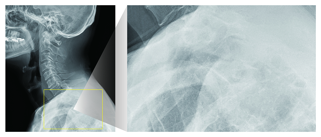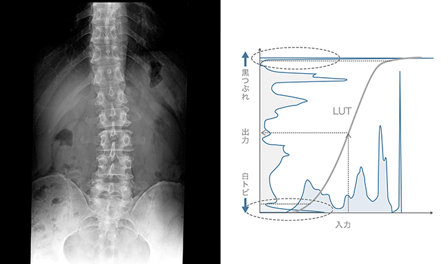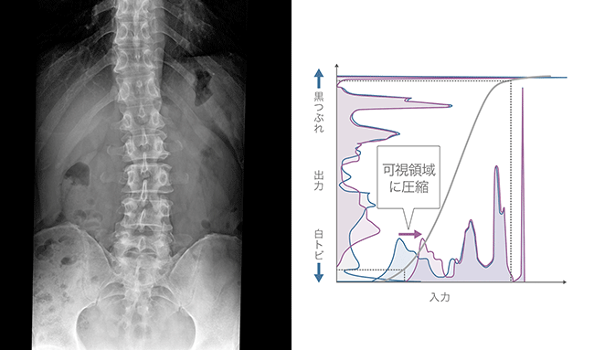 改良されたダイナミックレンジ圧縮の処理と、新規のLUT(階調カーブ)により、低線量域から高線量域まで各構造物を分離良く表現し、白トビ・黒ツブレを起こすことなく画像全体を自然なままに描出することで立体感のある画像を提供します。