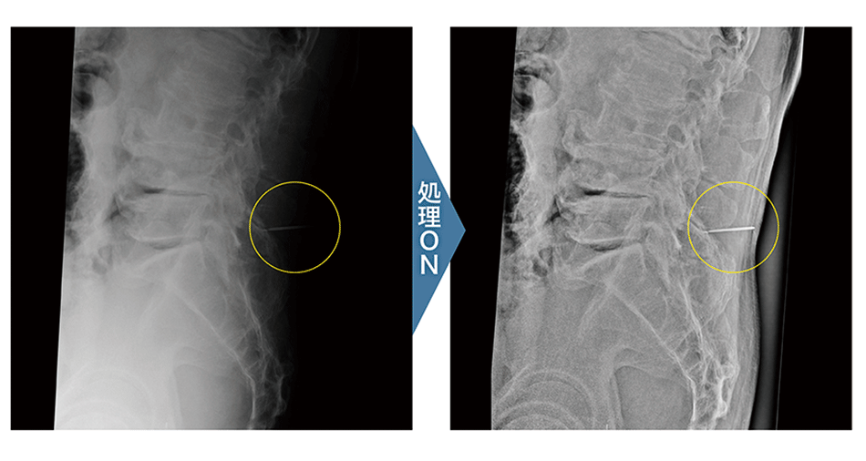 ポータブル撮影における残存物確認や、カテーテルの先端位置、ルート確認をしやすくするための 専用画像処理を搭載しています。 適用対象部位を拡大したことにより、ガラス片の確認や、胆道造影、 椎体の穿刺画像など多様なシーンでその効果が期待できます。