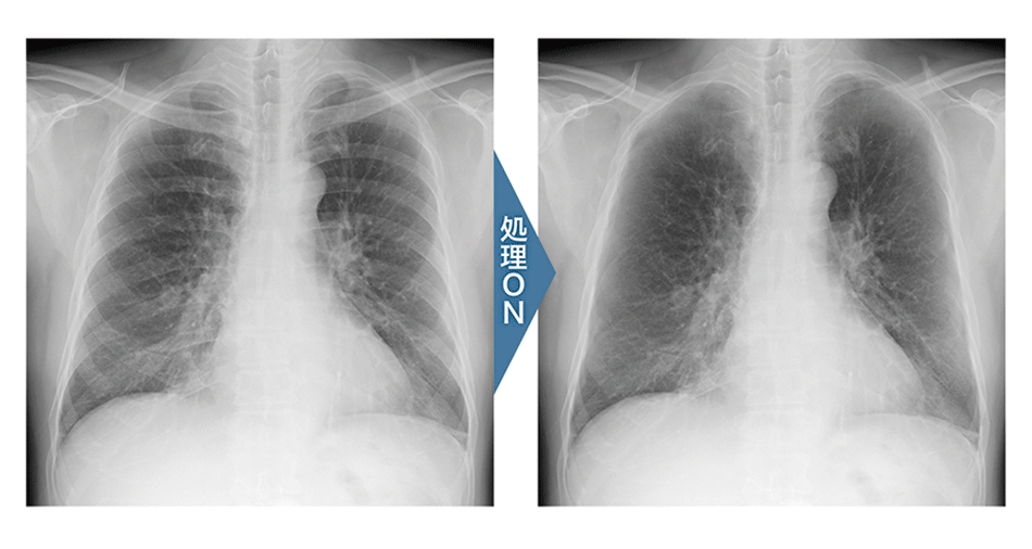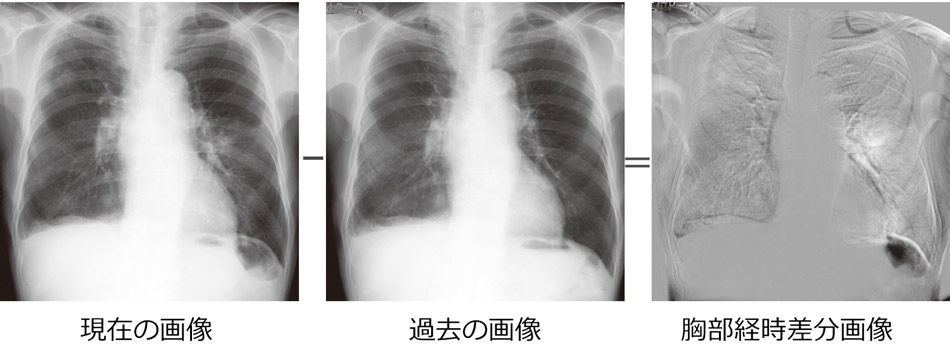 医師が頭の中でイメージしている「鎖骨 / 肋骨の減弱像」 を可視化することにより、読影を支援。 鎖骨・肋骨部分に隠れた病変の見落とし防止に貢献します。「胸部経時差分処理」では、医師が頭の中でイメージしている画像間の差を可視化することにより、読影を支援します。