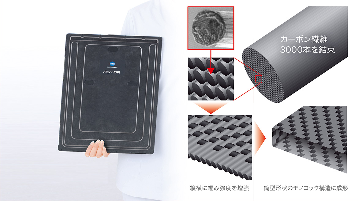 ワイヤレスタイプの可搬型DRとして、バッテリーを搭載しながら半切サイズでは3.0kgを切る重量を実現しました。日々の業務の中で最も重要なハンドリングにおいて一歩先行く可搬性を実現します。また、日々様々な衝撃や荷重からパネル内部を保護するために、軽量かつ剛性の高い筒型形状のモノコックカーボン筐体を採用しました。マグネシウム合金製の蓋部コーナーに落下衝撃を吸収する構造を採用。安心してお使いいただくため、軽量でありながら極めて高い堅牢性を実現しています。