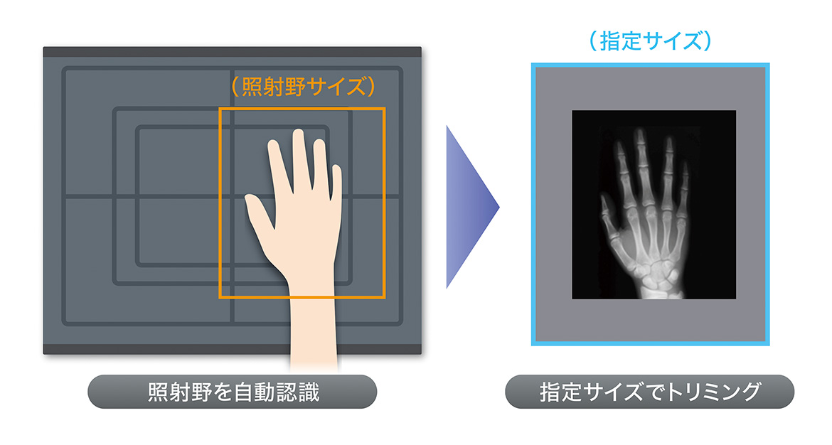 X線の照射野範囲を自動で認識し、最適な画像サイズで自動トリミングすることが可能です。トリミングサイズは、撮影条件キー毎にサイズとトリミング方法を設定することができ、フィルムサイズ、照射野サイズを選択、また撮影ごとに任意のサイズに変更することも簡単にできます。